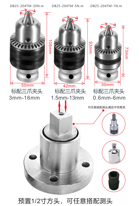 包装清单:扭力计X1、标配三爪夹头X1、传感器X1、使用说明书X1、手提便携箱X1